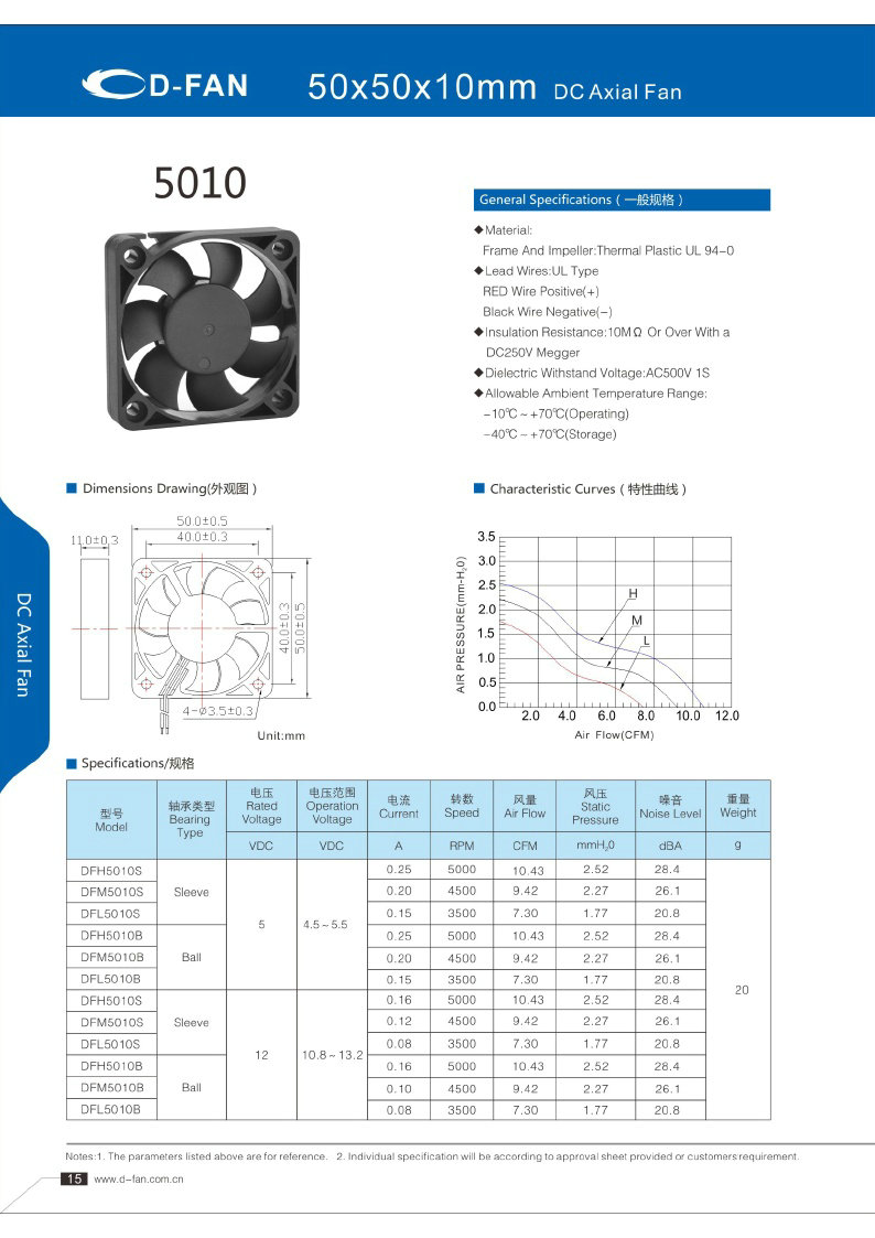 材料: 框架和葉輪:熱塑UL 94-0 引線.UL類型 紅色導線正極(+) 黑線負極(-) 絕緣電阻:10MΩ或以上,帶DC250V高阻表 介電耐壓:AC500V 1S 允許環境溫度范圍: -10℃-+70℃(運行) -40℃-+70℃(儲存)